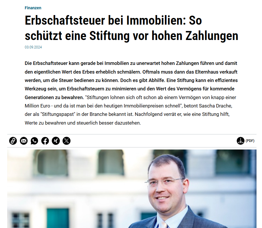 Wenn über Stiftungen, Vermögenssicherung und Nachfolge gesprochen wird, taucht auch Stiftung.de regelmäßig in der Berichterstattung auf. Hier findest du eine Auswahl an Presseerwähnungen, Interviews und Beiträgen, in denen über unsere Arbeit berichtet und Sascha Drache als Experte eingeordnet wurde. Die Artikel zeigen, in welchen Kontexten unsere Erfahrung rund um Stiftungsgründung, Stiftungsverwaltung und strategische Vermögensstrukturierung aufgegriffen wird – sachlich, praxisnah und mit Blick auf langfristige Lösungen.